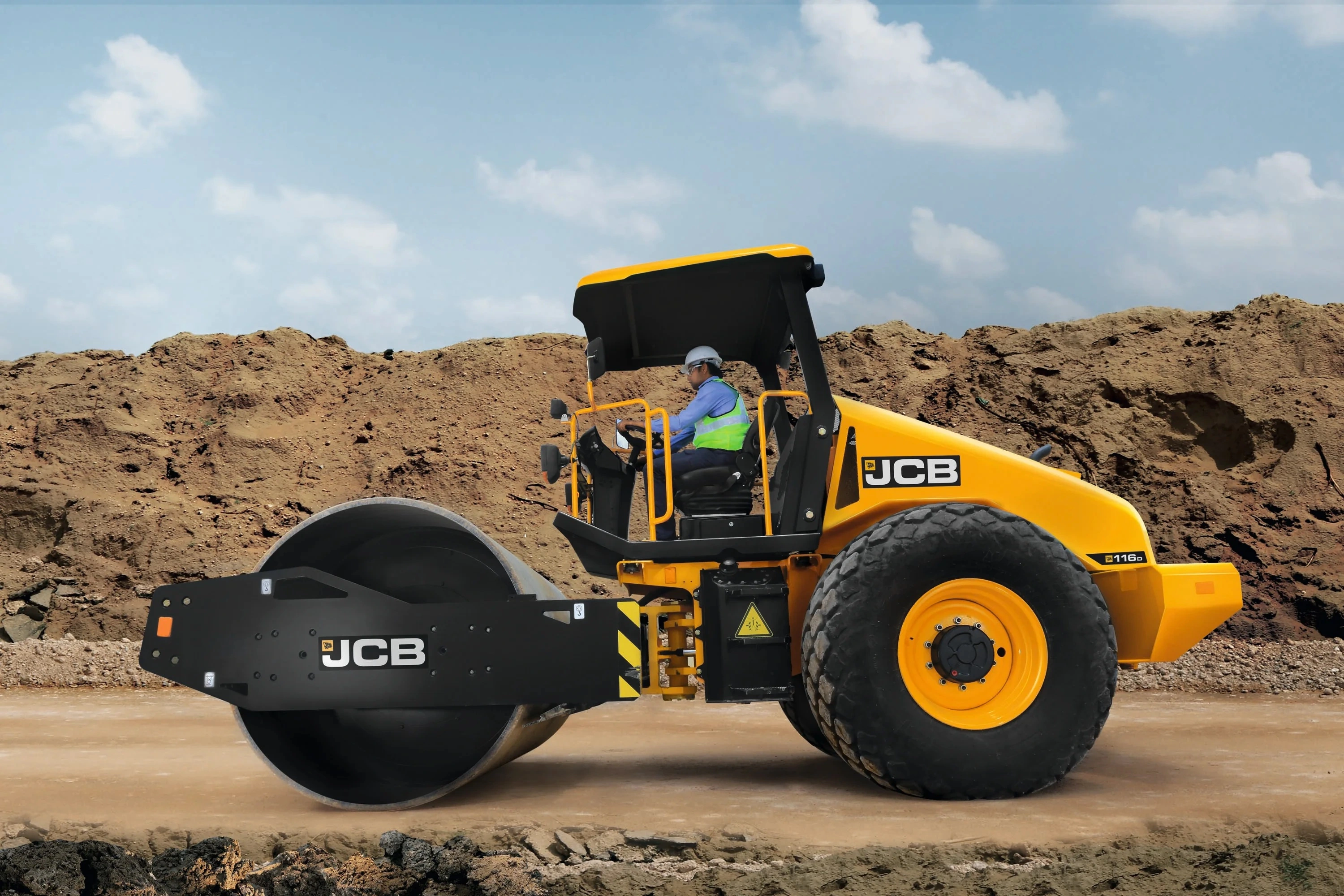 Công suất, hiệu suất, năng suất: JCB 116D đạt hiệu suất tối đa nhờ két hợp tỷ suất trọng lượng phía trước cao và hệ thống rung thích ứng hạng nặng.